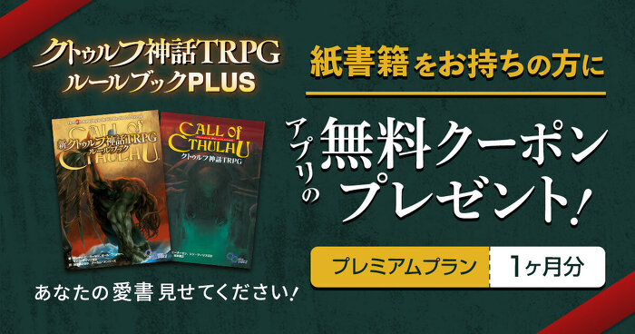 今回は『クトゥルフ神話TRPG ルールブックPLUS』のリリースを記念し、今まで書籍を愛してくれたユーザー様への感謝の気持ちをこめたキャンペーンを実施させていただくことをお知らせします。