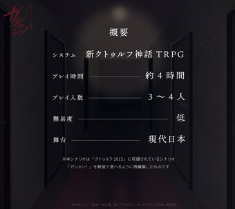 『クトゥルフ2015』収録の『ガシャン!』を新クトゥルフ神話TRPG(新版)のシステムで遊べるように再編集したものです。舞台は古びたホテルで、最恐と名高いホラー要素満載のシナリオです。