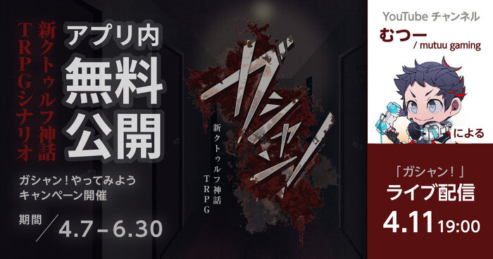 この企画にあわせて、4/11(火)19:00~よりYoutubeチャンネル『むつー mutuu gaming』にて『ガシャン!』のプレイをライブ配信いたします。
