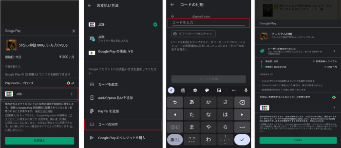 ・Google Play の購入画面で「お支払い方法」から、[コードの利用] をタップしてクーポンコードを入力