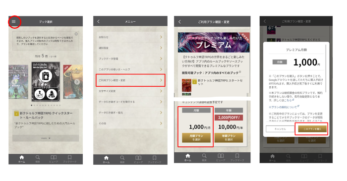 ・メニュー>「ご利用プラン確認・変更」画面で「プレミアム(月額)」を選択>「このプランを購入」