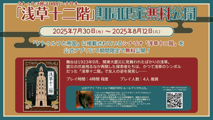 公式アプリ「クトゥルフ神話TRPG ルールブックPLUS」にて、「クトゥルフと帝国」に掲載されているシナリオ「浅草十二階」を期間限定で無料公開いたします。