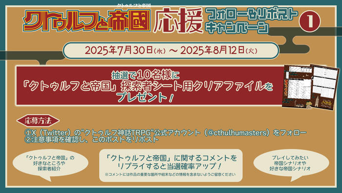 期間中、X(Twitter)の"クトゥルフ神話TRPG"公式アカウントをフォローし、対象のポストをリポストした方の中から抽選で10名様に「クトゥルフと帝国」探索者シート用クリアファイルをプレゼントいたします。