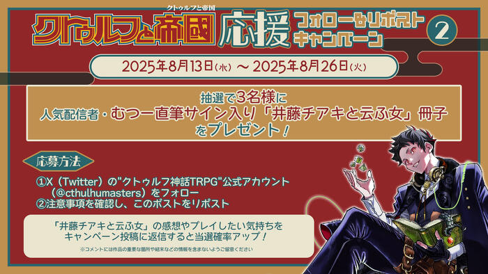 期間中、X(Twitter)の"クトゥルフ神話TRPG"公式アカウントをフォローし、対象のポストをリポストした方の中から抽選で3名様に人気配信者・むつー直筆サイン入り「井藤チアキと云ふ女」冊子をプレゼントいたします。
