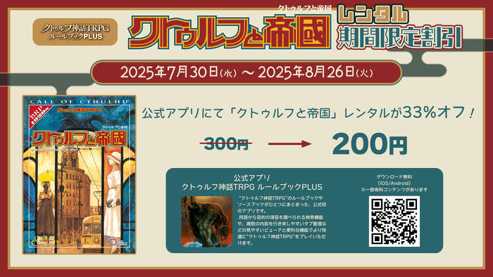 期間中、公式アプリ「クトゥルフ神話TRPG ルールブックPLUS」にて、「クトゥルフと帝国」のレンタルを通常価格より33%オフの200円にてご利用いただけます。