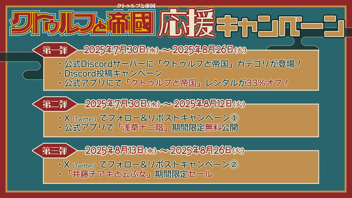 キャンペーン第二弾として、前半期間に「クトゥルフと帝国」探索者シート用クリアファイルが当たるキャンペーンや、公式アプリにてシナリオ「浅草十二階」の期間限定無料公開を開催いたします。