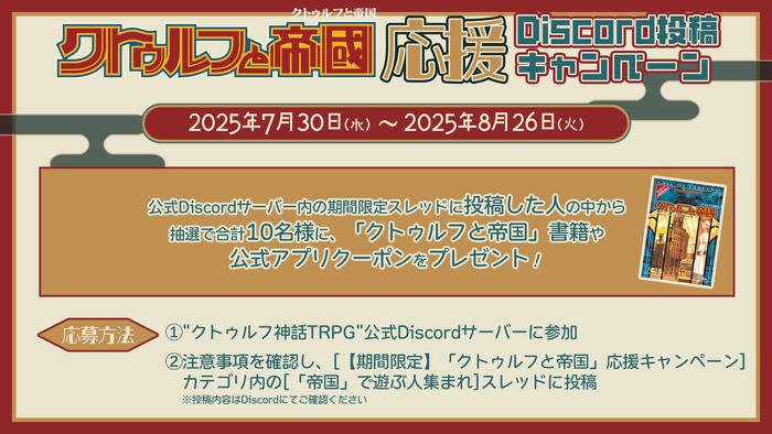 期間中は”クトゥルフ神話TRPG”公式Discordサーバーにて、「クトゥルフと帝国」のソースブックやシナリオの魅力を解説する期間限定チャンネルの公開や、一緒に遊ぶ仲間や「クトゥルフと帝国」好きの友達を探すスレッドを開設いたします。