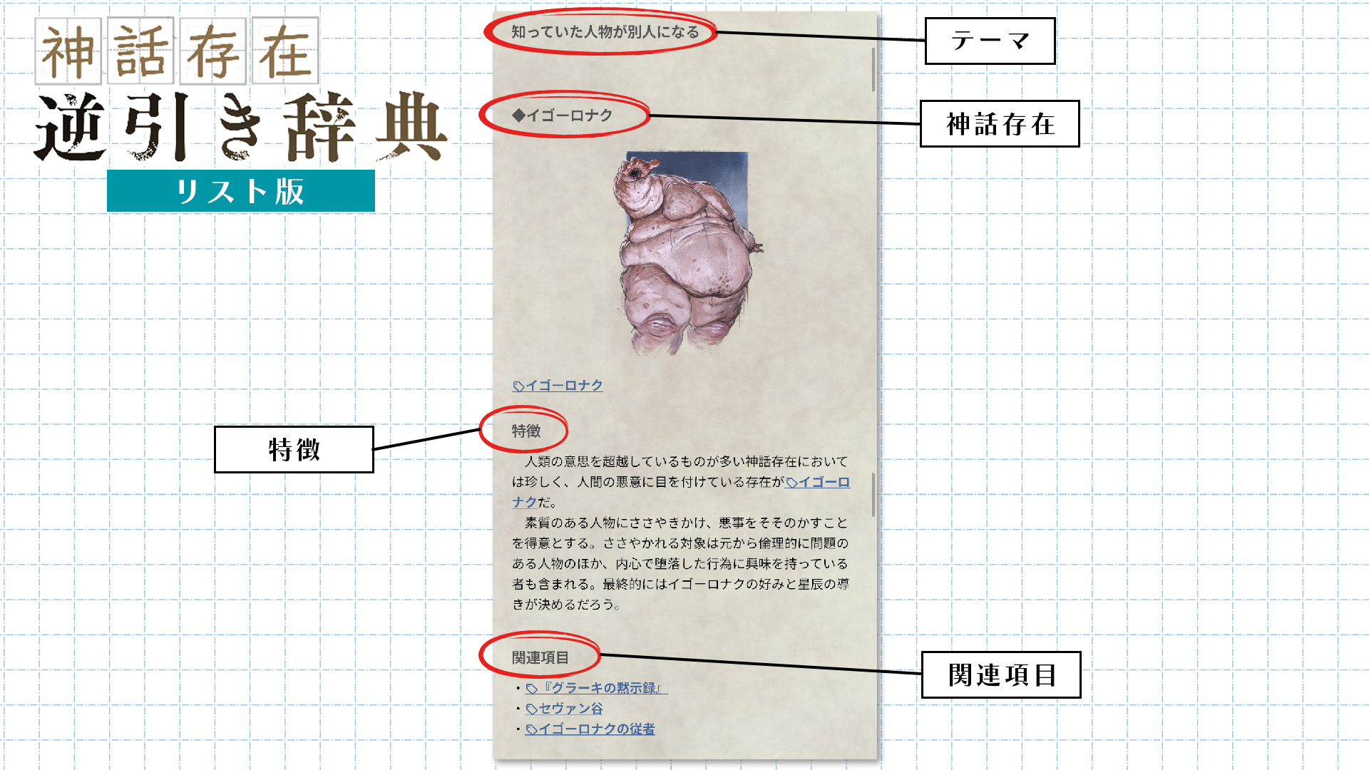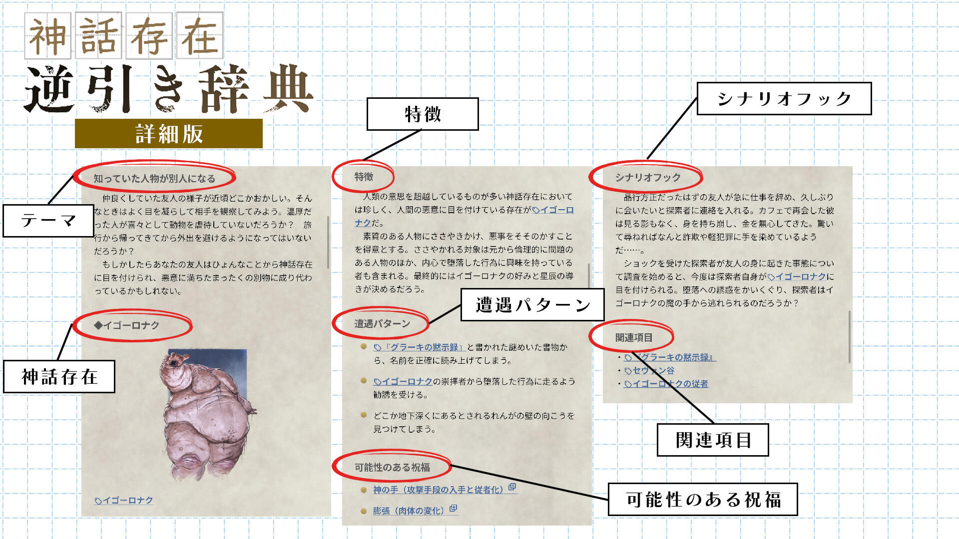 その神話存在を登場させるシナリオフックの例が記載されています。 - 関連項目