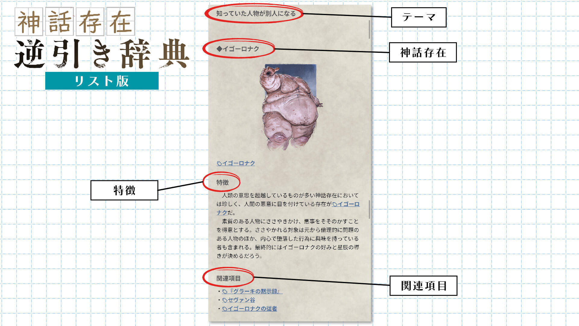 「神話存在逆引き辞典 β版」はテーマ別に神話存在を逆引きできるシナリオ制作者向けコンテンツです。「悪夢を見せる」などのテーマ別に複数の神話存在を紹介しているので、現象や与えたい恐怖などを起点にシナリオのアイデアを膨らませることができます。また、その神話存在に関連するキーワード情報やシナリオフックなども掲載しているため、幅広い視点でシナリオ制作のヒントを得ることも可能です。