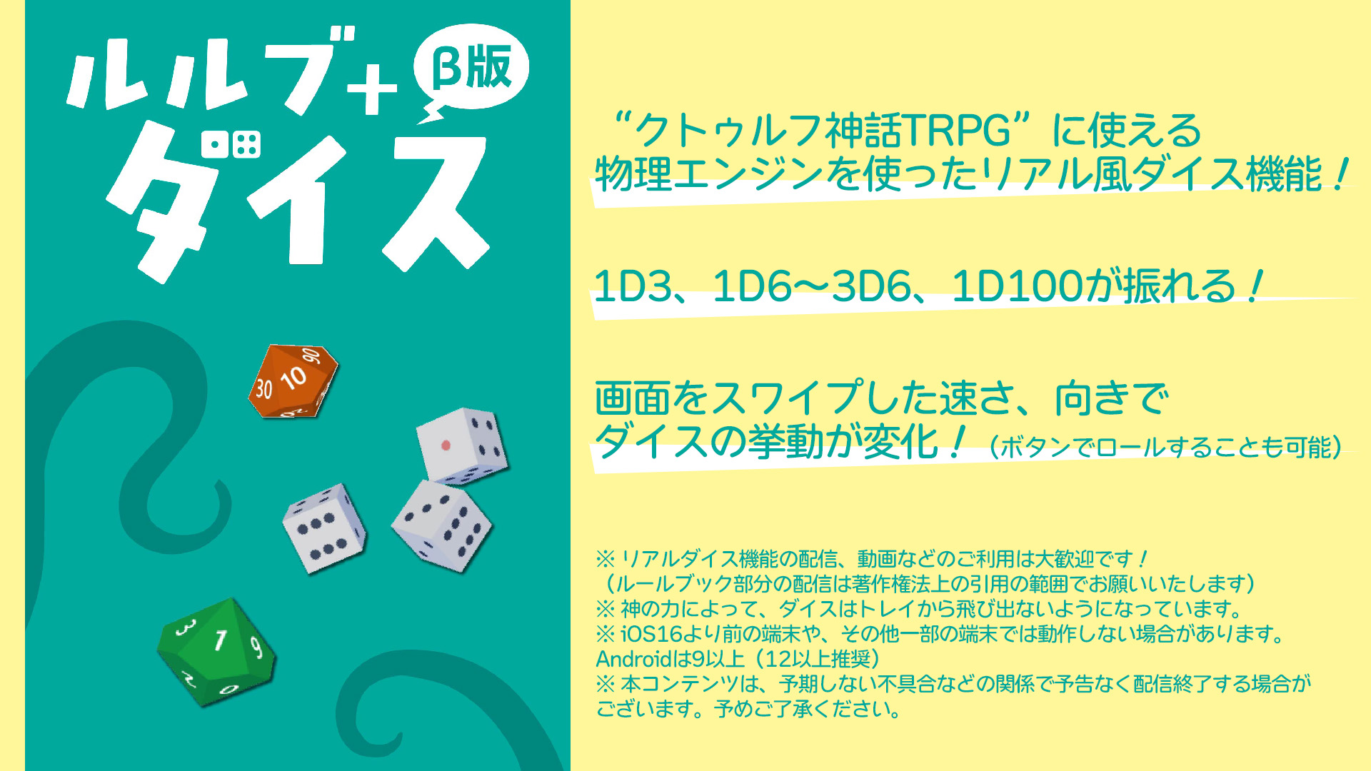 ※ リアルダイス機能の配信、動画などのご利用は大歓迎です!(ルールブック部分の配信は著作権法上の引用の範囲でお願いいたします)