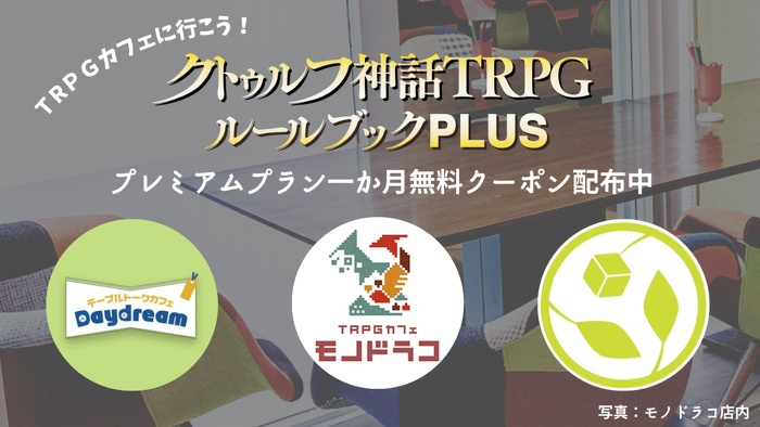 「テーブルトークカフェ Daydream」(神田)「TRPGカフェモノドラコ」(神楽坂)「mistel~ミステル~」(池袋)を利用された方の中でご希望の方に「クトゥルフ神話TRPG ルールブックPLUS」のプレミアムプラン1ヶ月無料クーポンを配布しています。