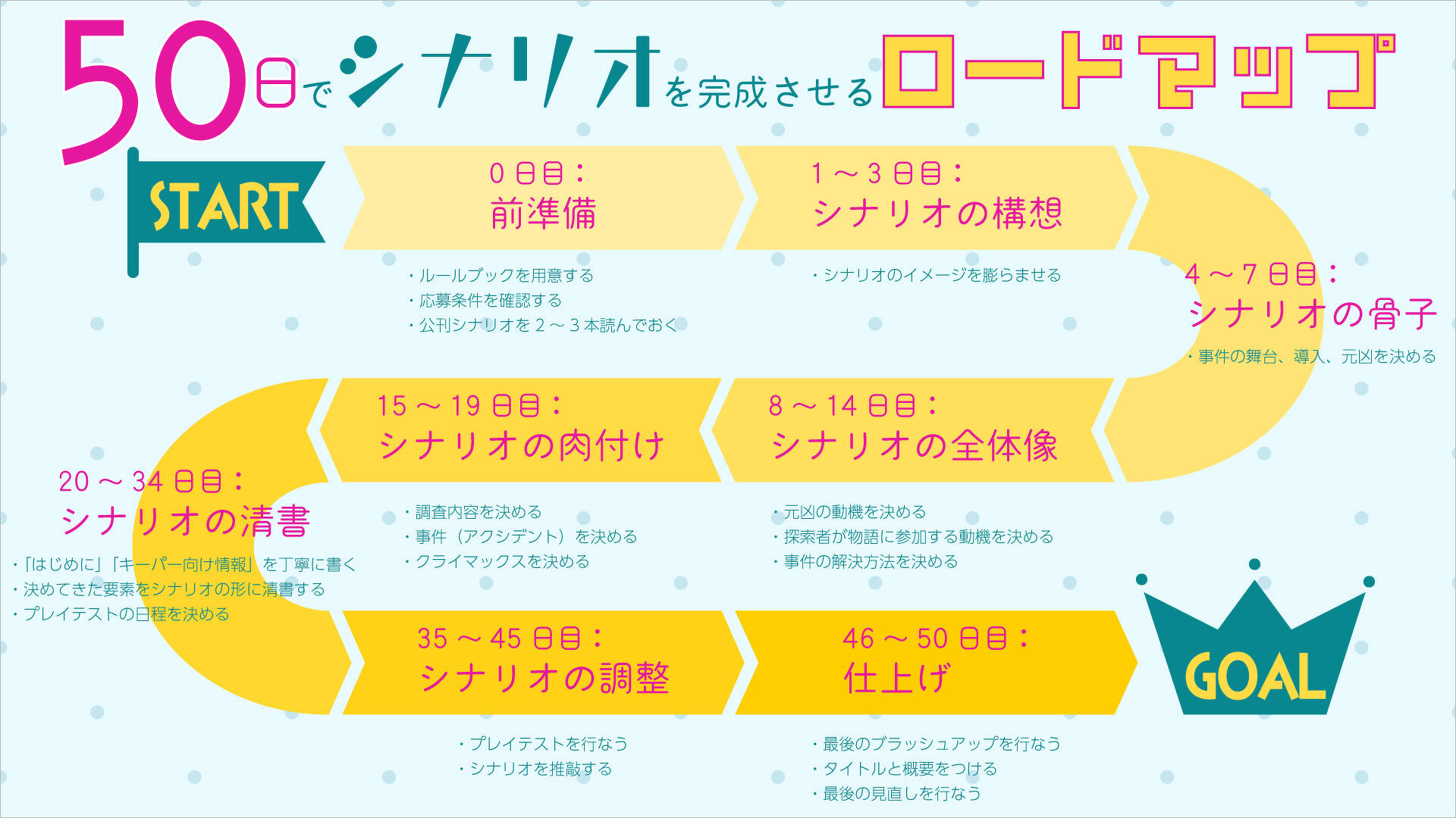 このロードマップはあくまで参考なので、自分が選んだシナリオにあわせて自由に調整してかまいません。例えば、シナリオの舞台となる時代や町の歴史を調べる時間を多く取る、といった進め方もよいでしょう。