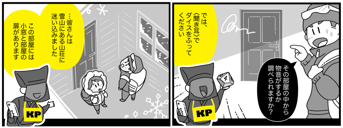このダイス・ロールと、キーパーの進行、プレイヤー同士でのコミュニケーションを繰り返して、全員で物語を紡いでいきましょう。