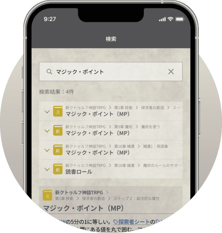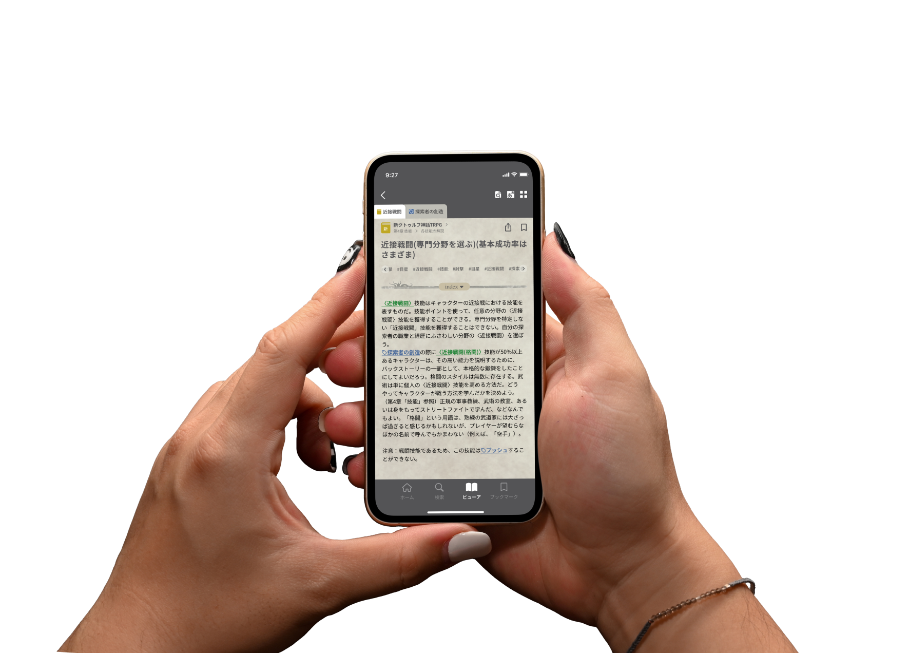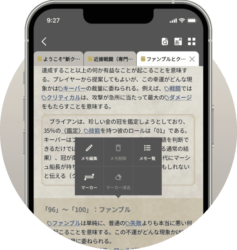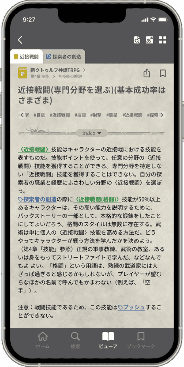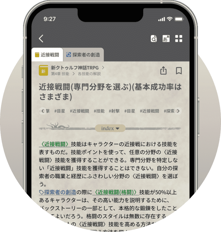 キーワードや技能名は「タグ」としてハイライト表示され、情報を把握しやすくなっています。またタブを活用することで、複数のページを同時に閲覧することができます。シナリオとルールを並べて見たいときなどに便利!
