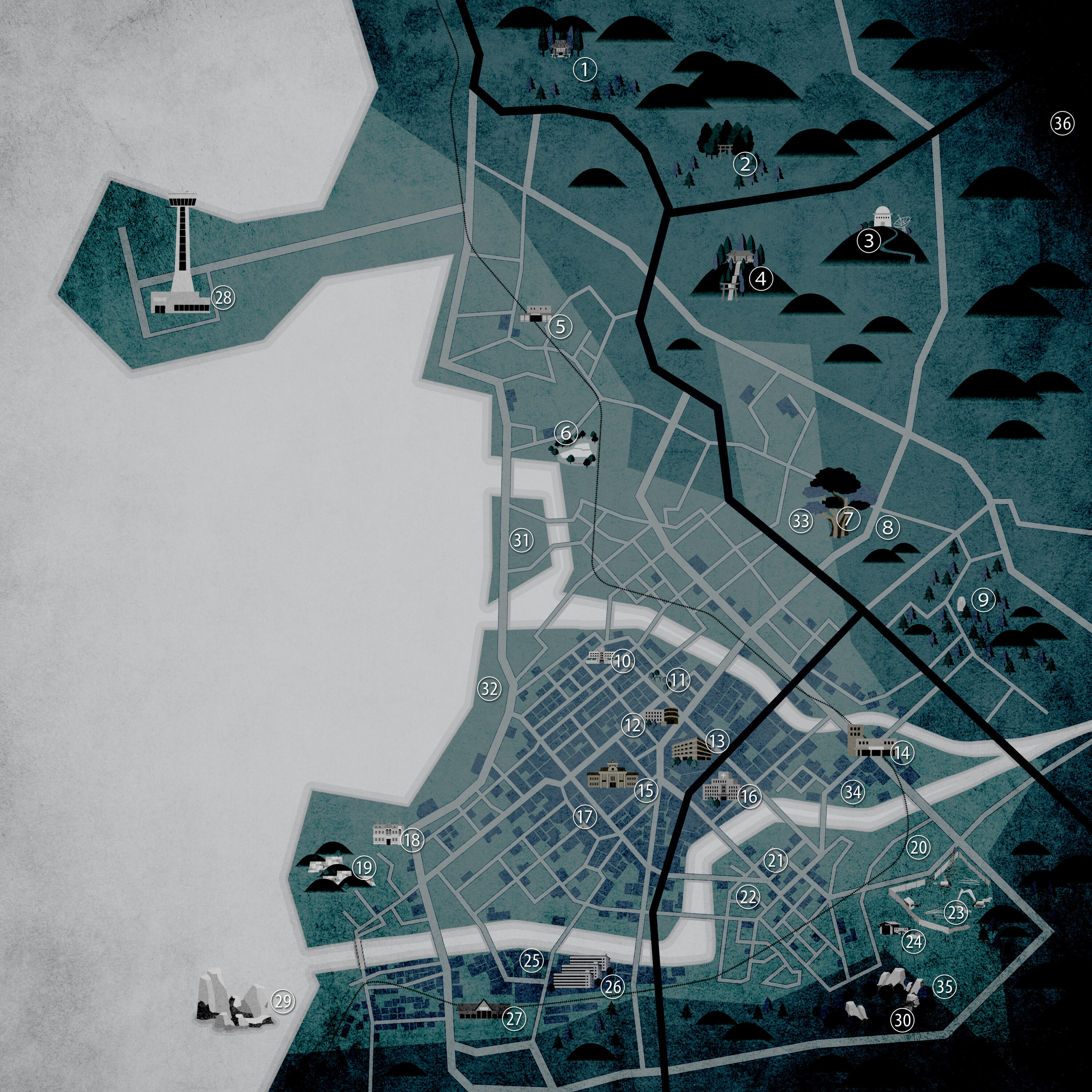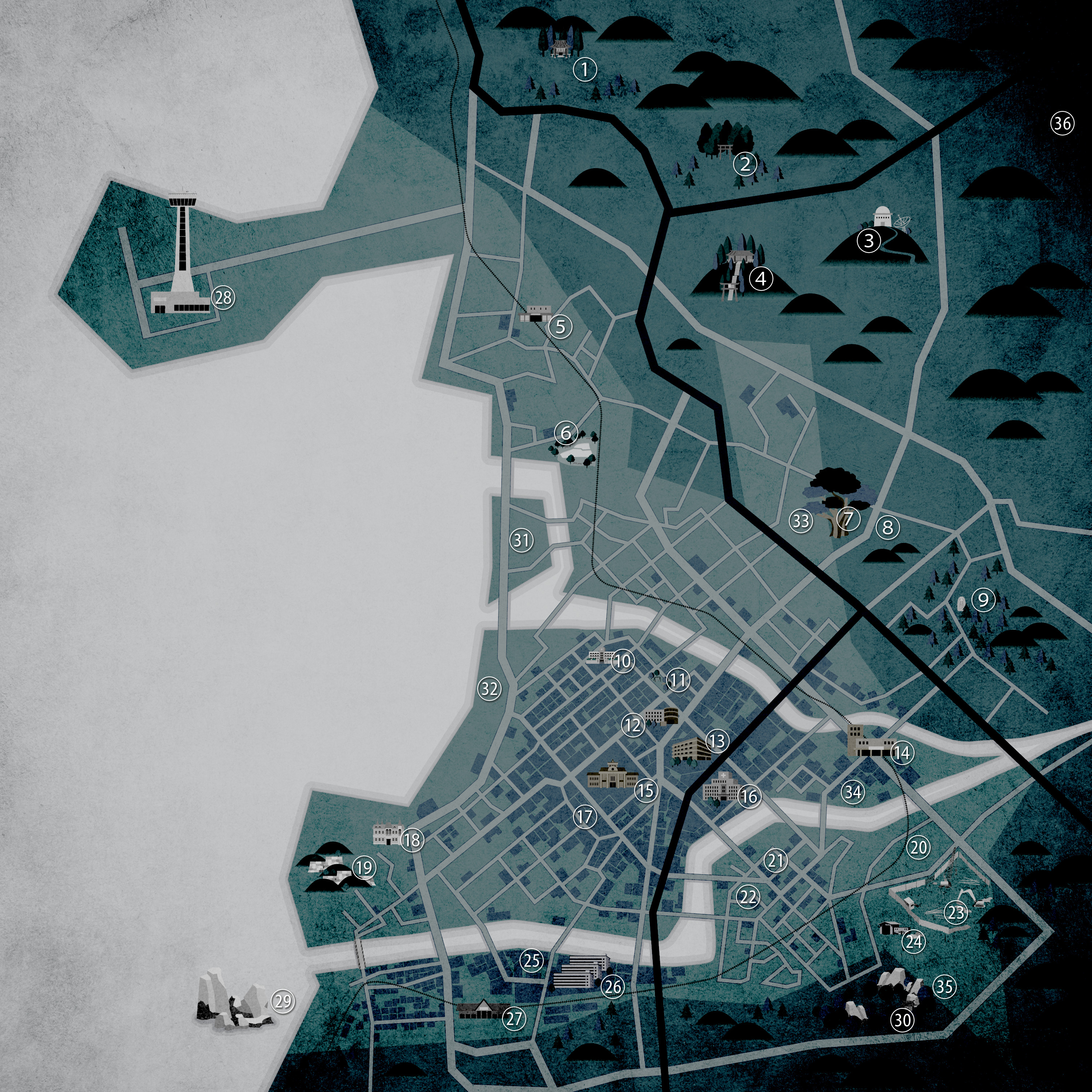 七伏市には既刊のシナリオの舞台となる施設も存在するが、