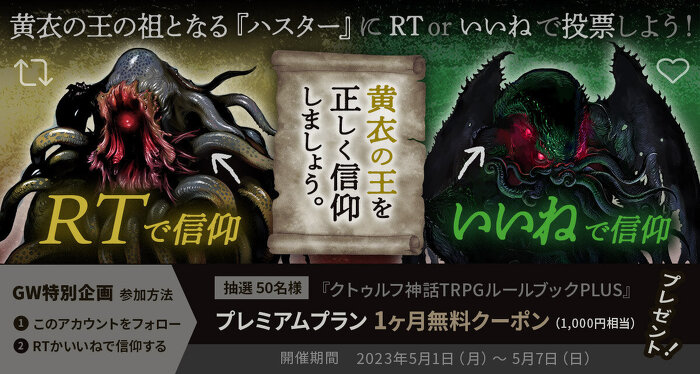 該当ツイートの内容に従ってご応募いただいた方の中から抽選で50名様に、スマートホン向けアプリ『クトゥルフ神話TRPGルールブックPLUS』のプレミアムプラン1か月無料クーポン(1,000円相当)をプレゼントいたします。