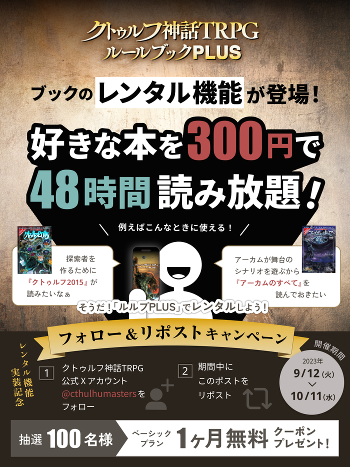スマートフォン向けアプリ『クトゥルフ神話TRPG ルールブックPLUS』に新しく「レンタル機能」が登場!